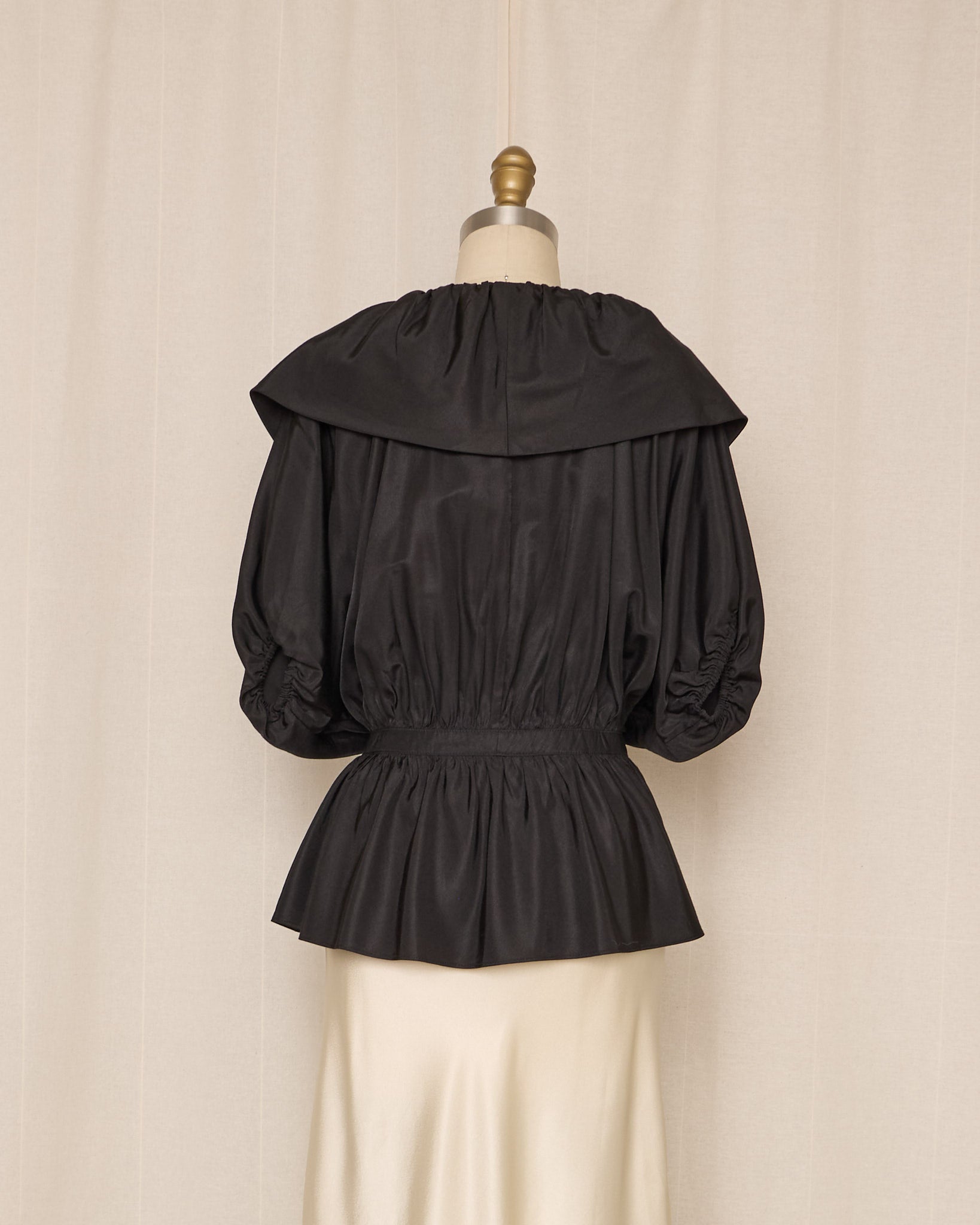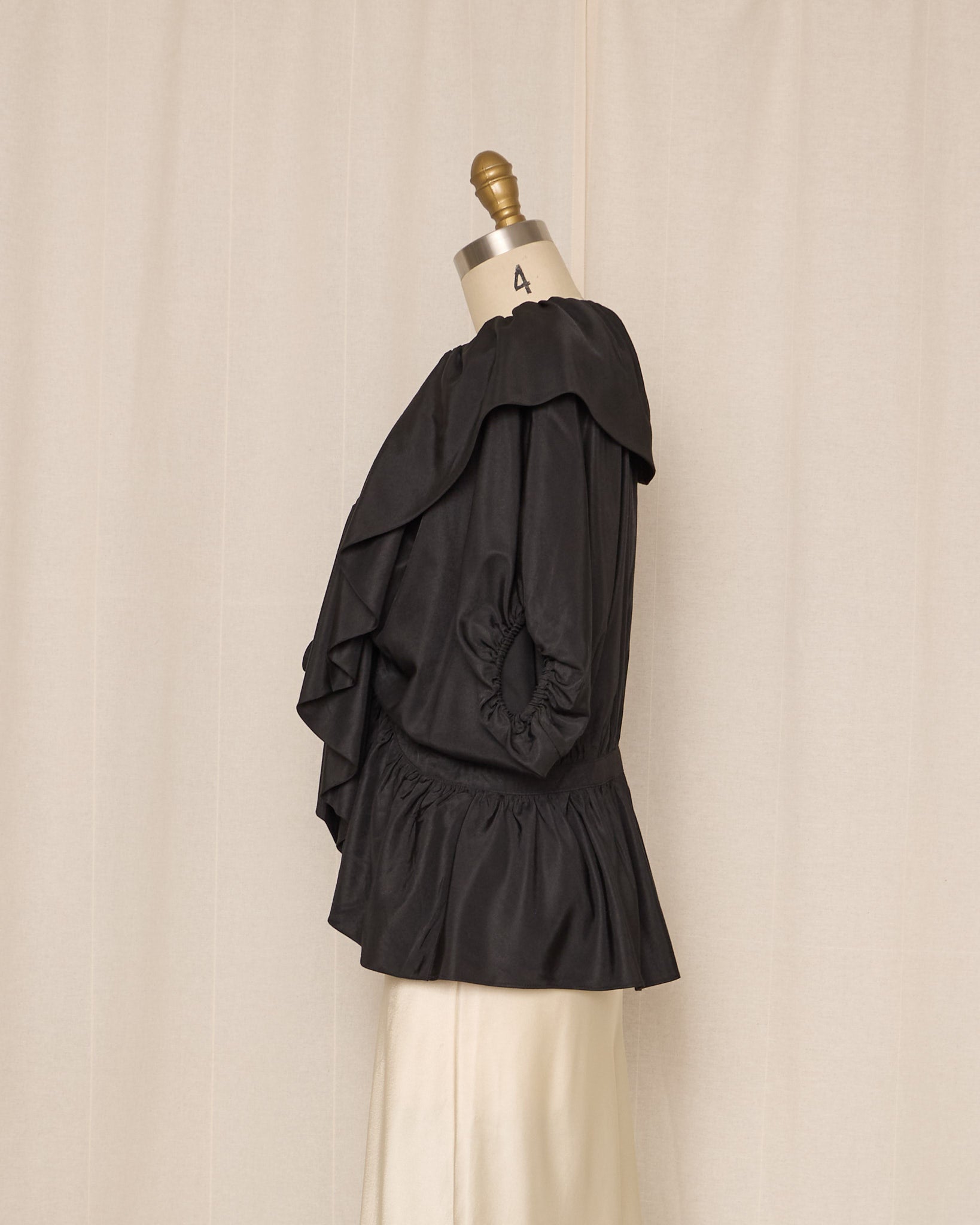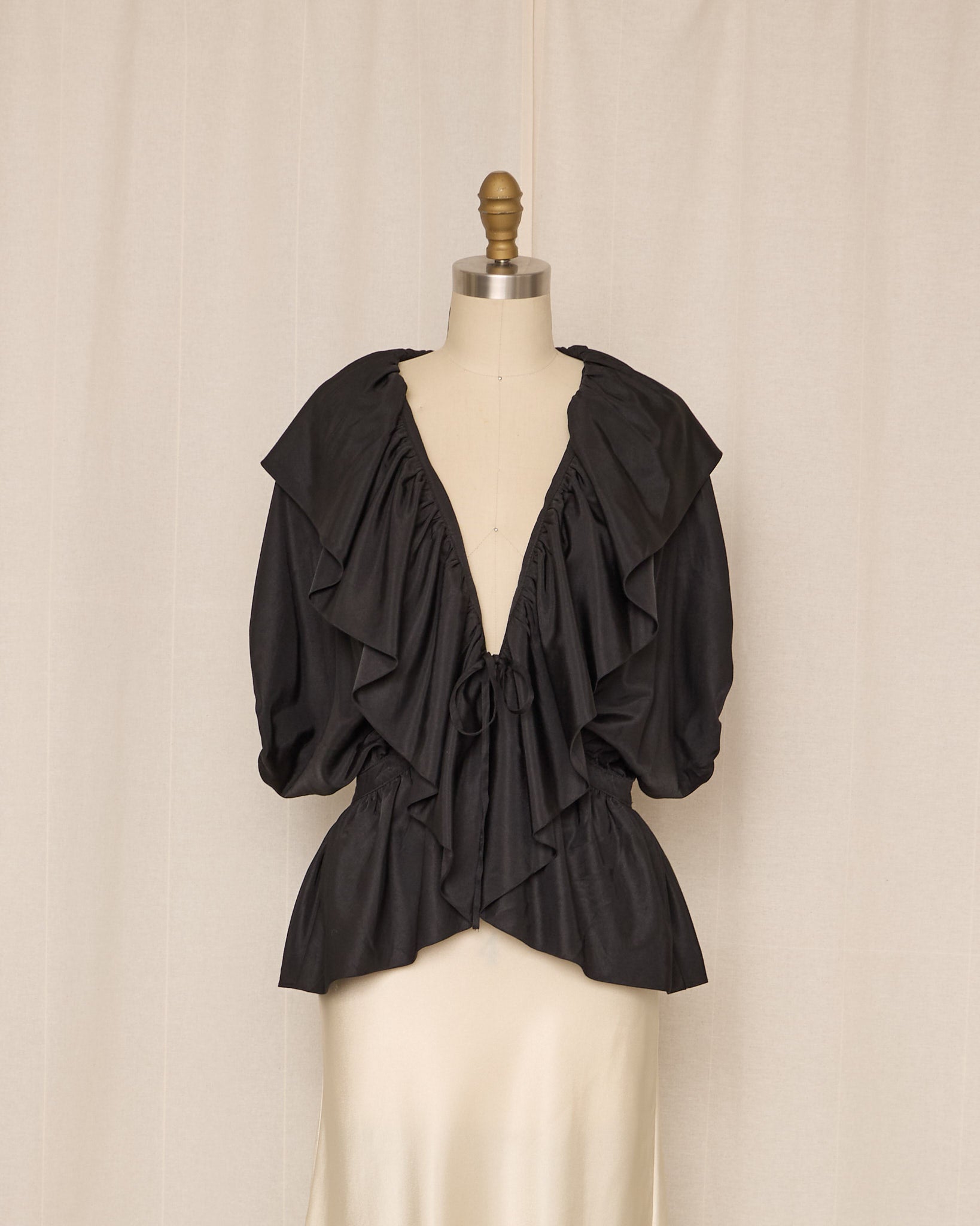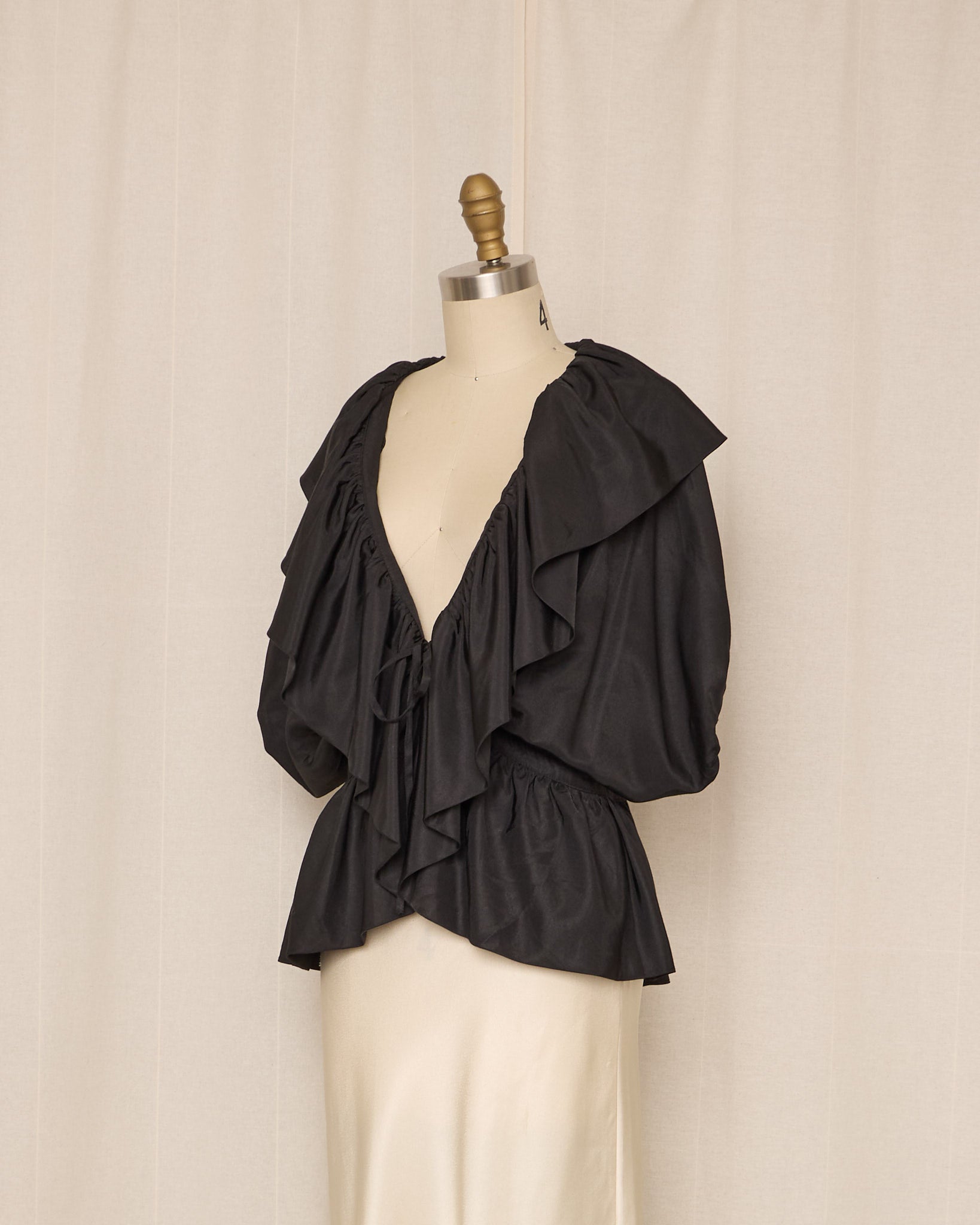Black cocoon-style top featuring oversized ruffle trim along a deep-V neckline, voluminous sleeves, and a cinched waist for a sculpted silhouette. Designed with a front tie closure.