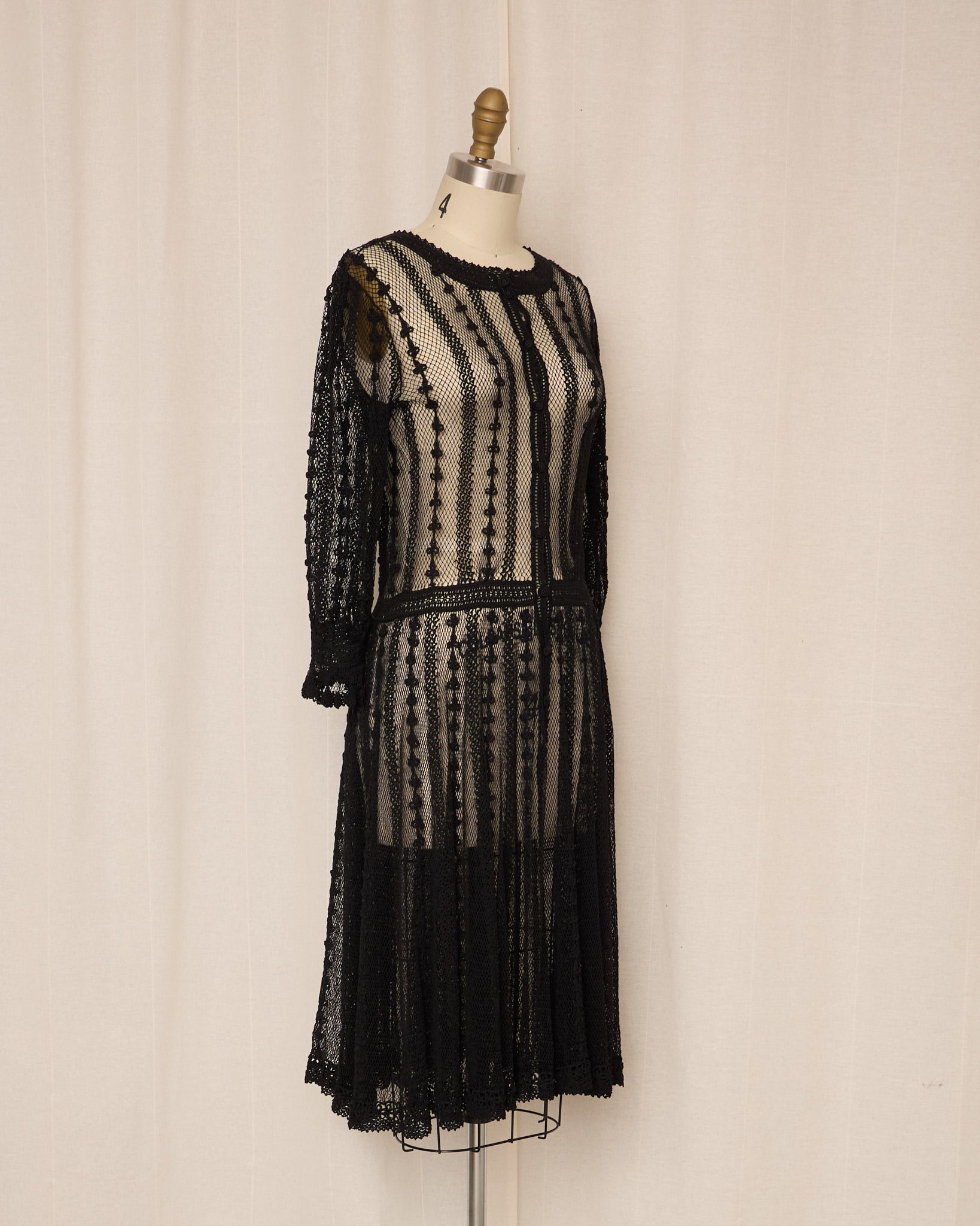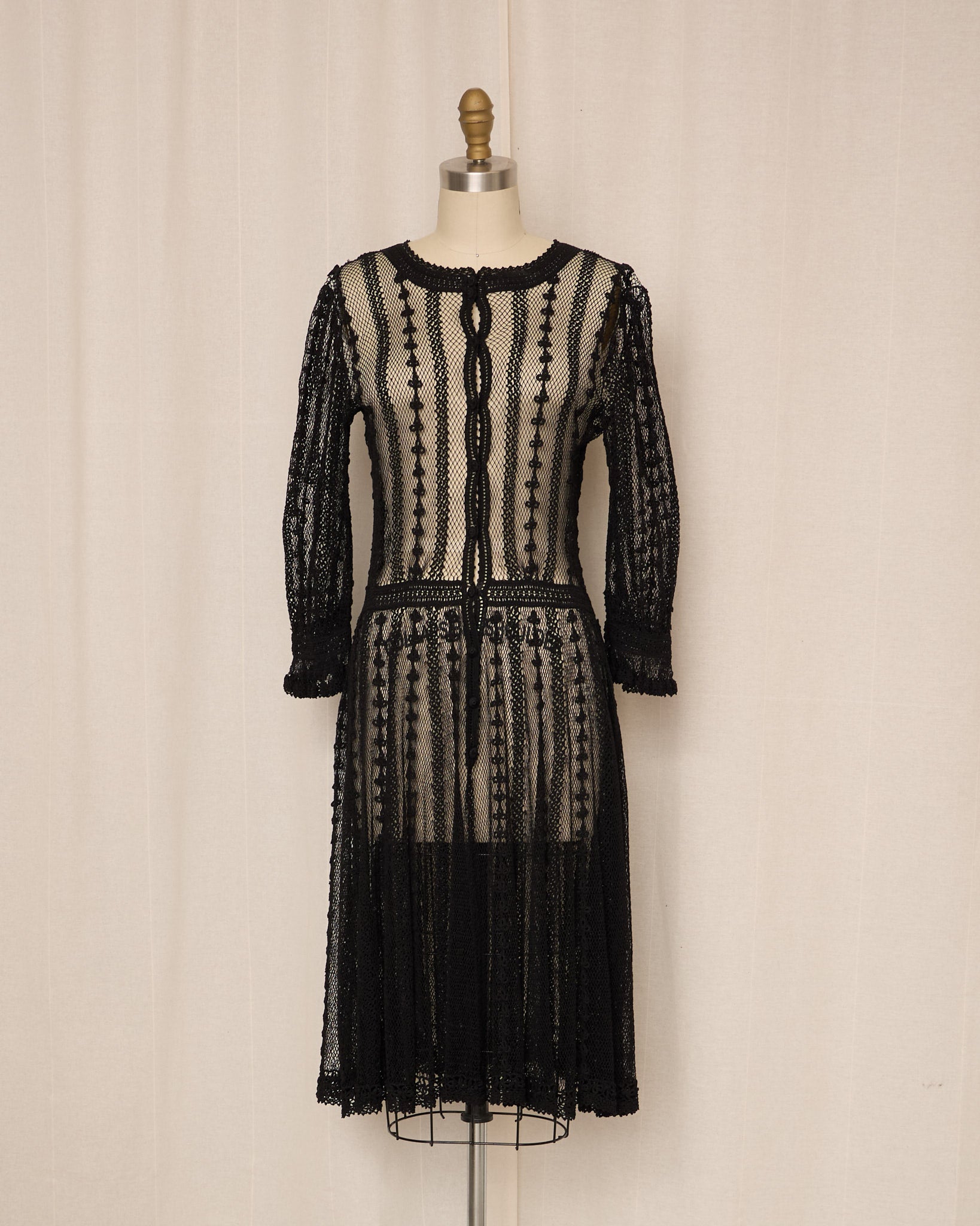 Vintage black crochet dress featuring an openwork knit with intricate vertical patterning and sheer texture. Front button down closure.