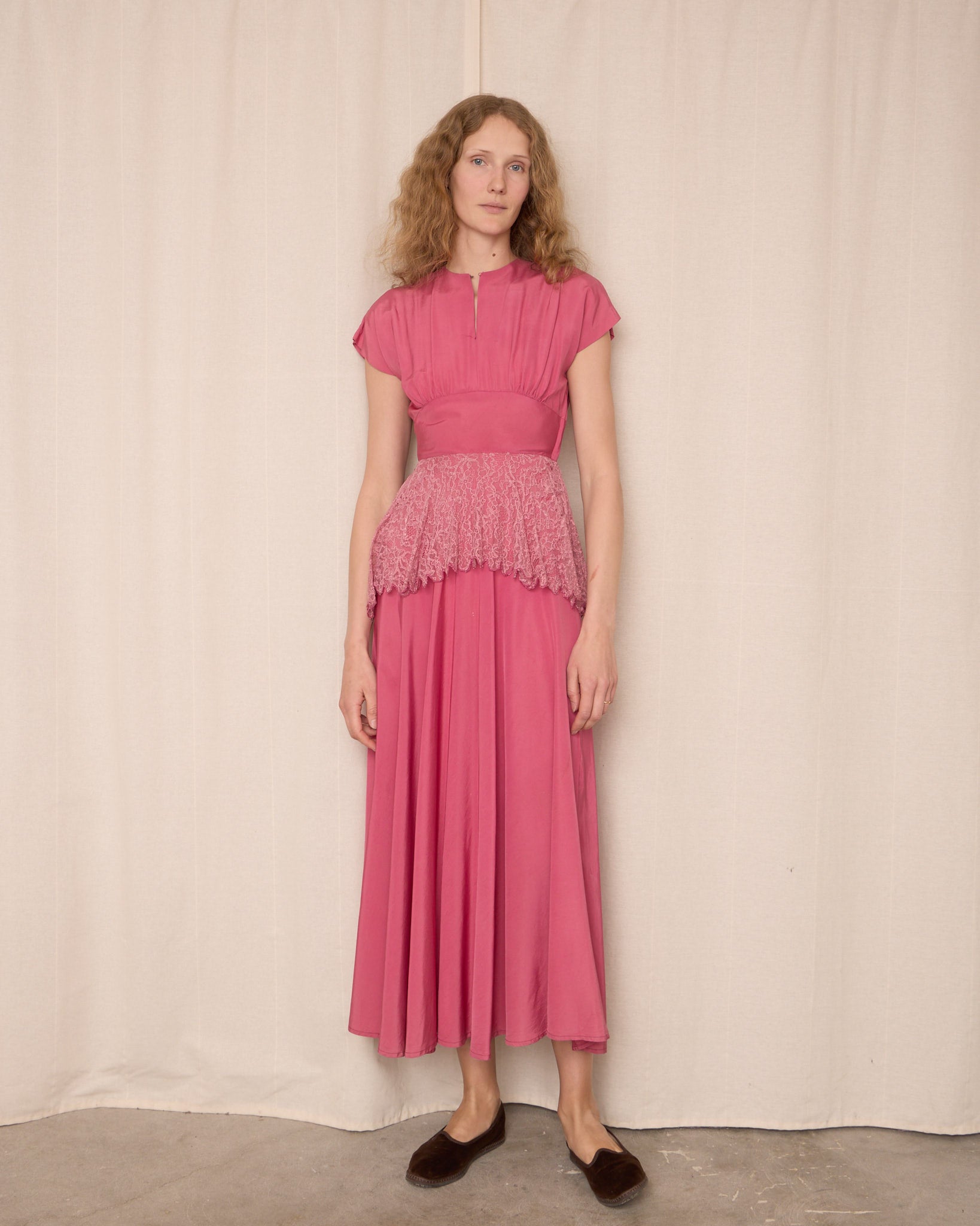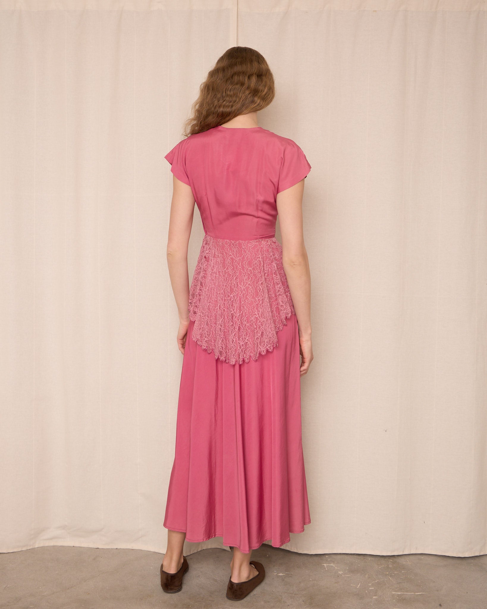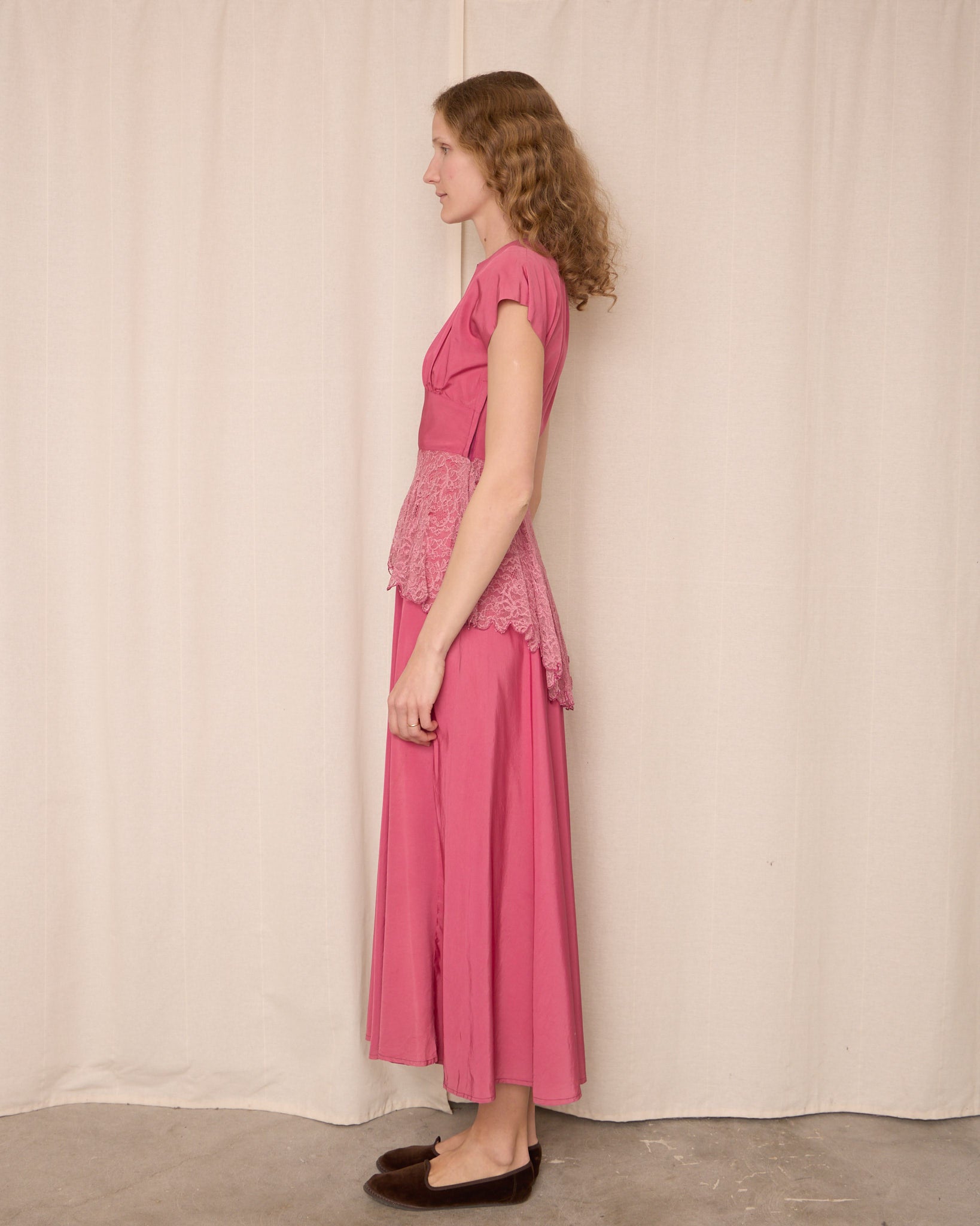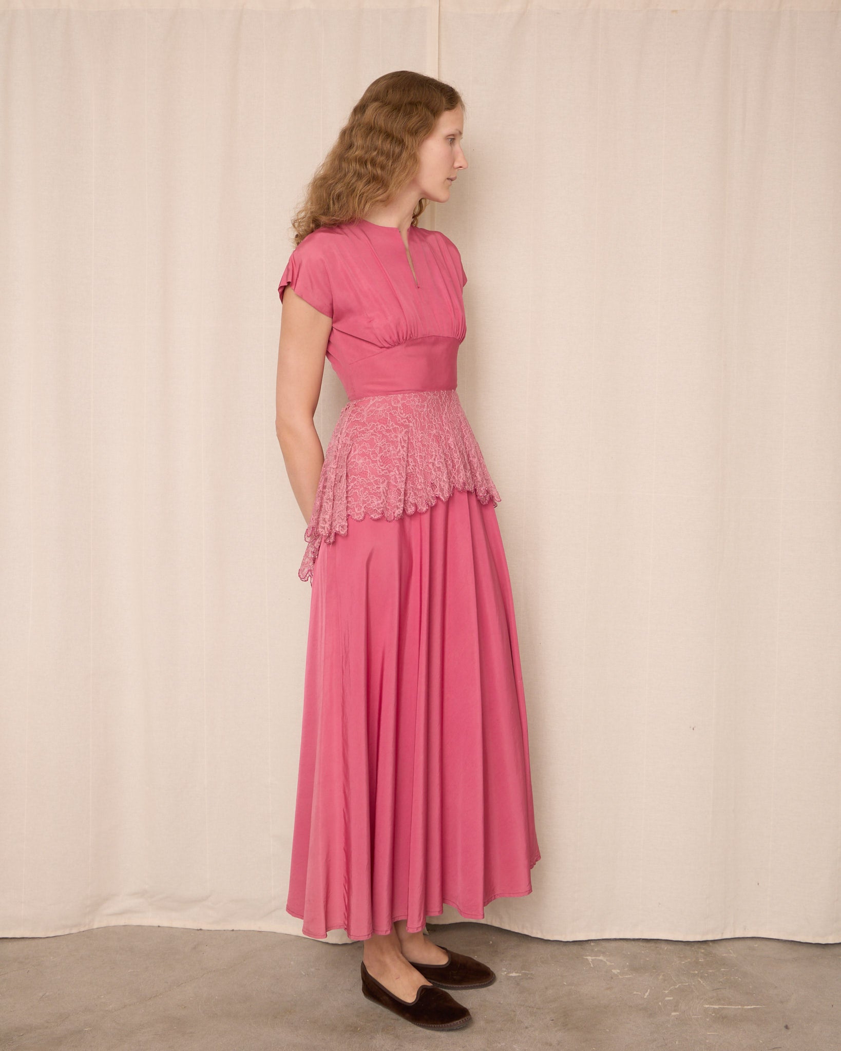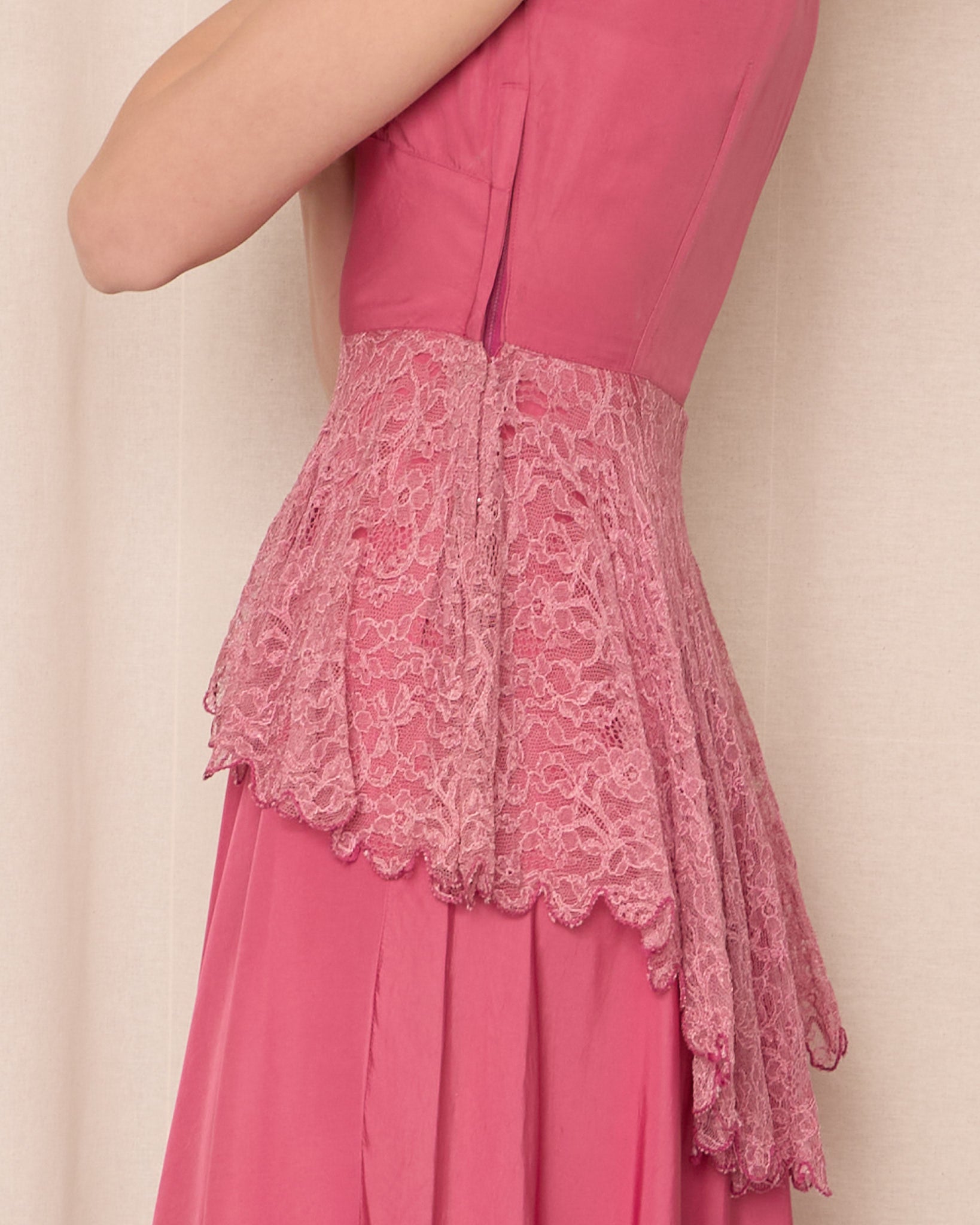 Vintage long pink dress featuring a softly gathered bodice, cap sleeves, fitted waist, and flowing full-length skirt. Delicate lace overlay at waist adds elegant shape. Covered side zipper closure.