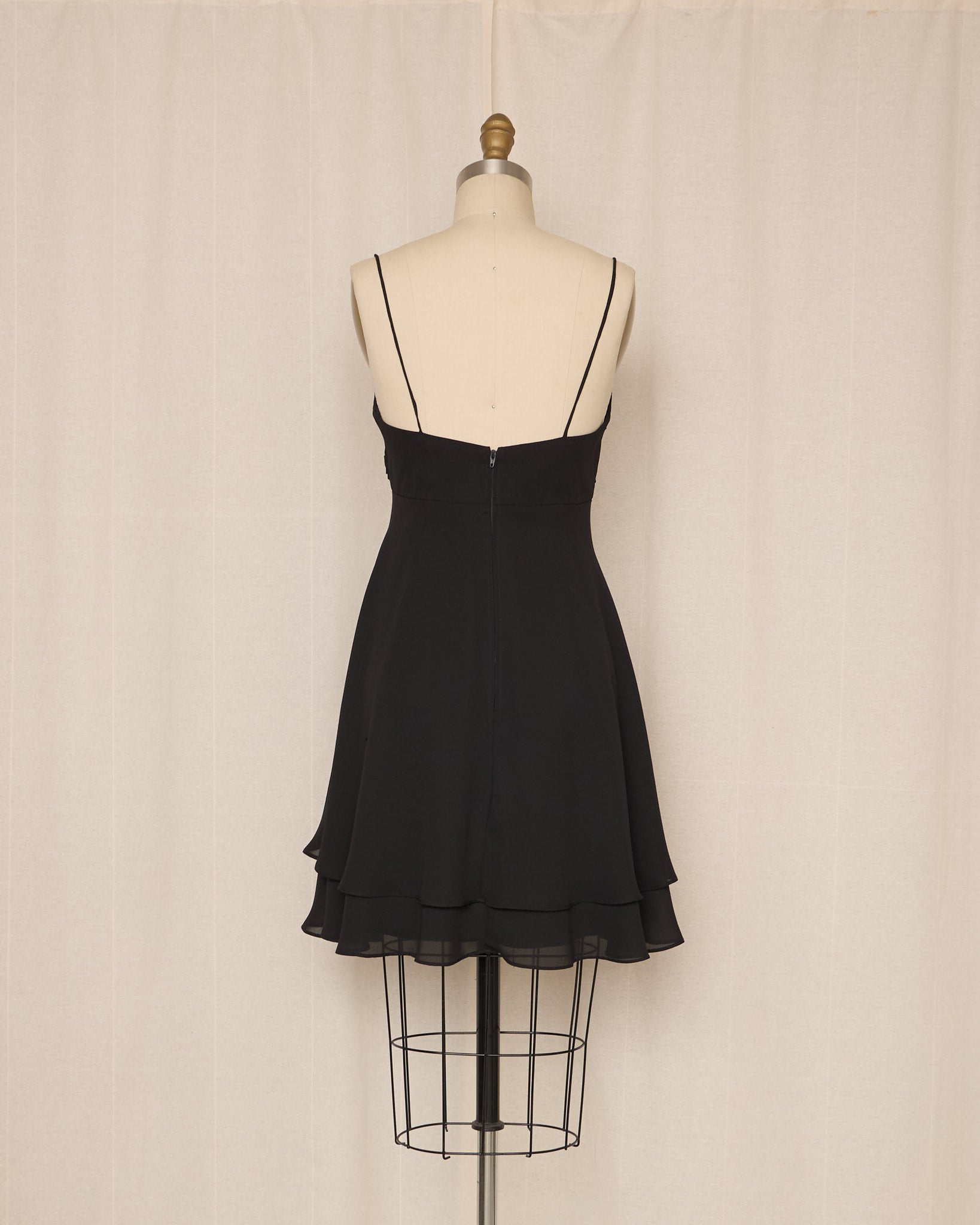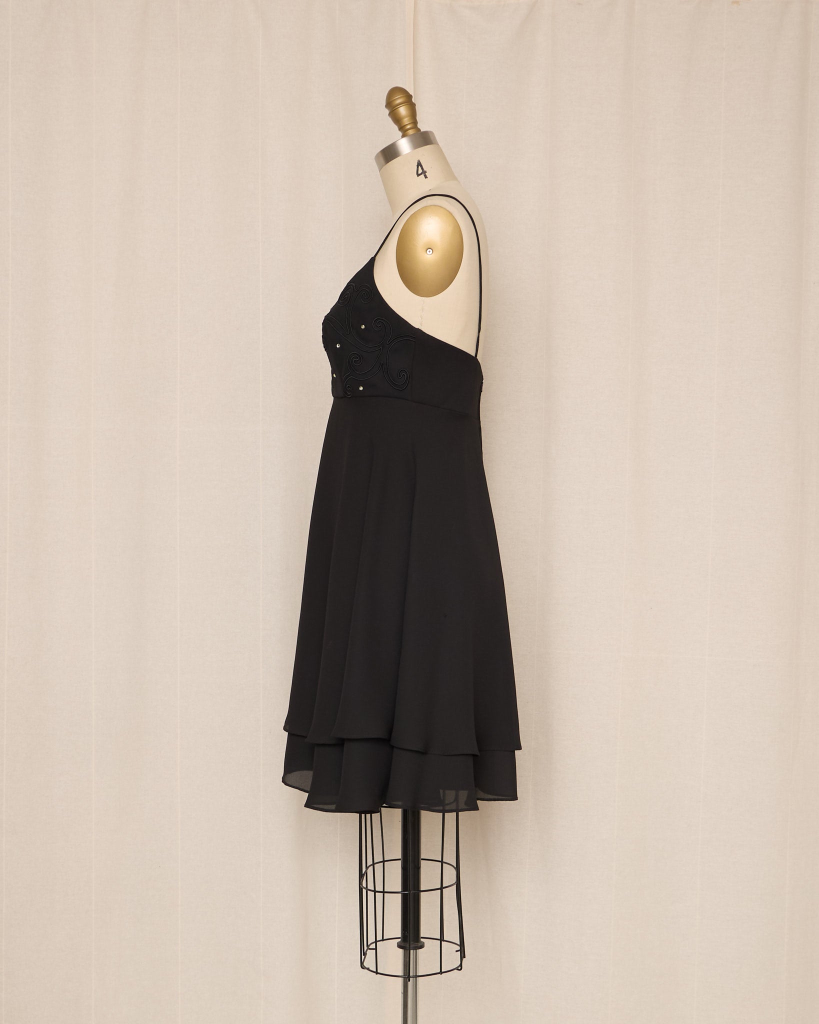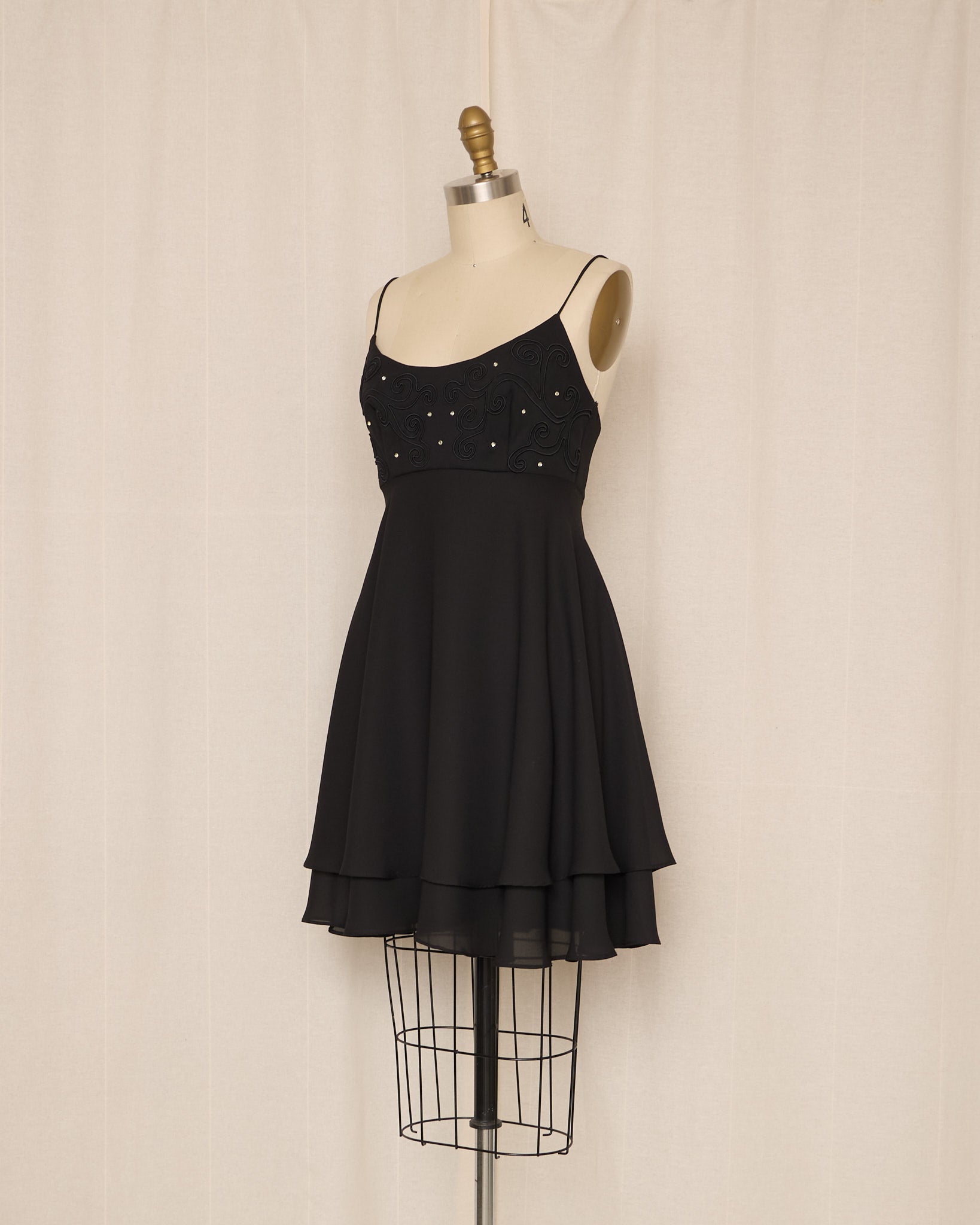 Vintage Faviana black mini dress with a fitted bodice detailed with subtle swirl embroidery and rhinestone embellishments, and skirt falls in a soft, fluid drape. Back zip closure, thin straps, made in USA.