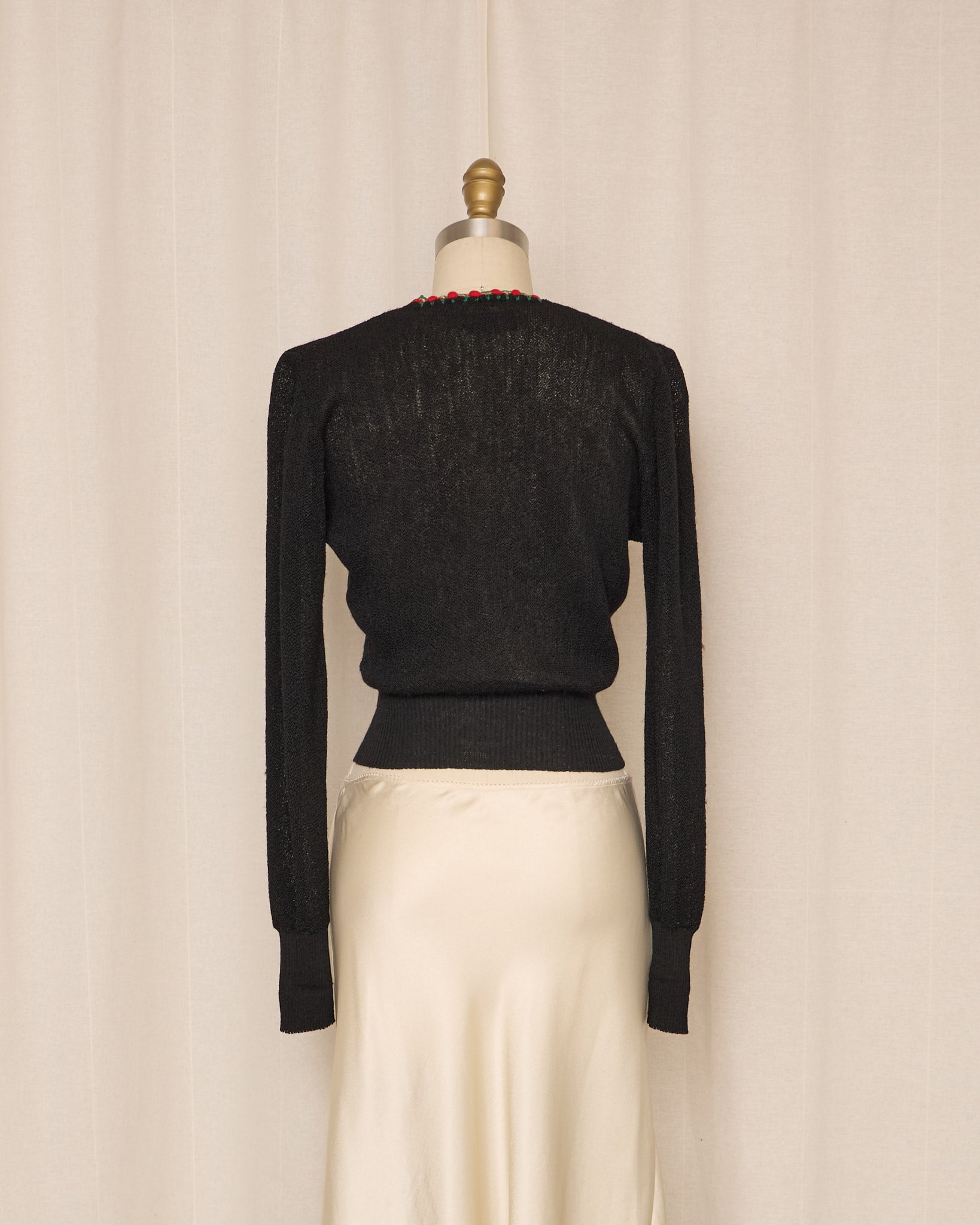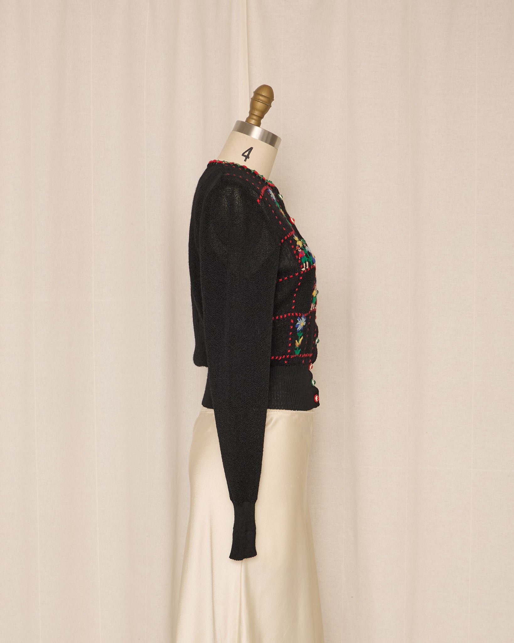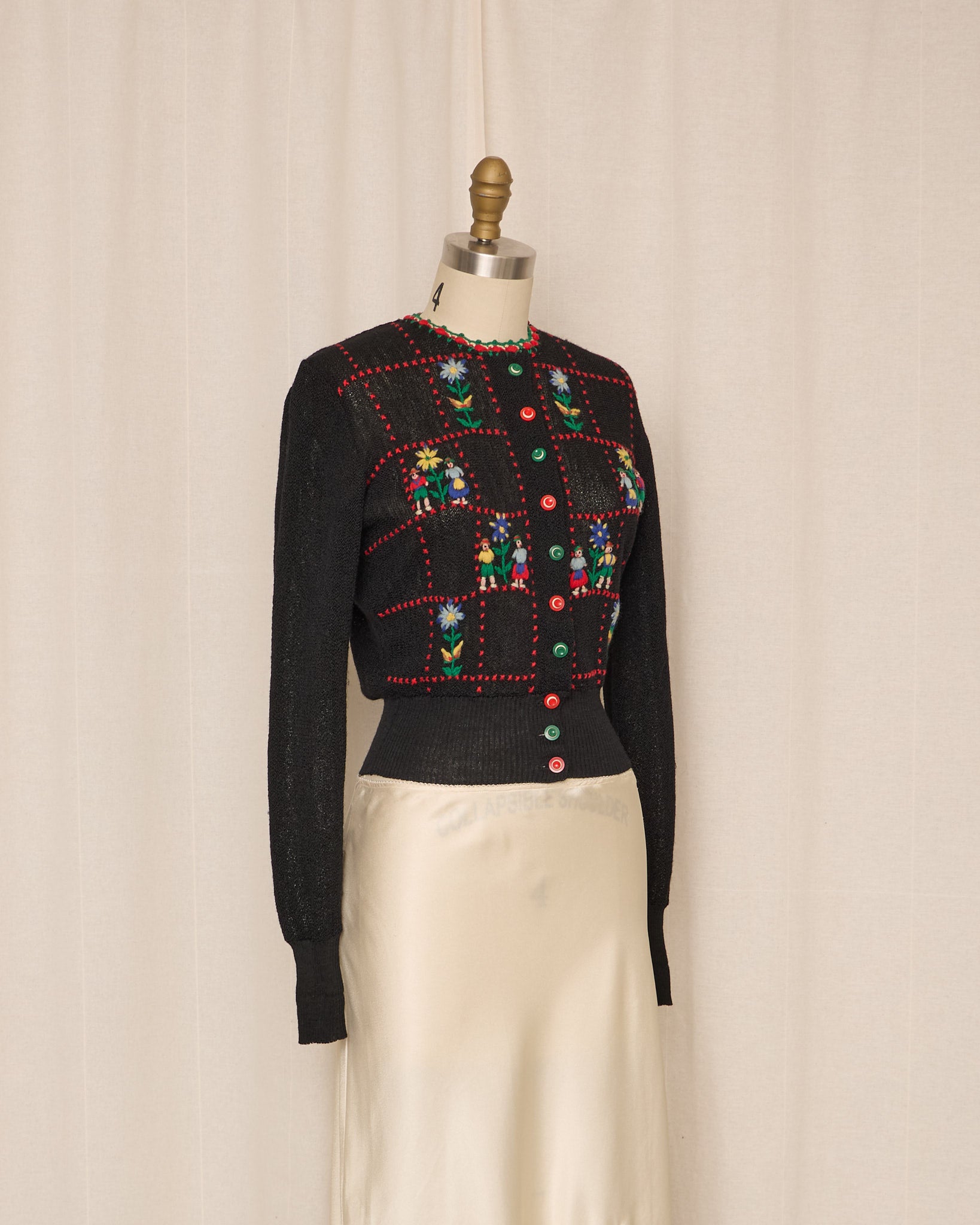 Charming, detailed vintage embroidered cardigan featuring colorful folk-inspired motifs. Designed with a round neckline, ribbed hem, and multicolor button front closure, and fitted silhouette