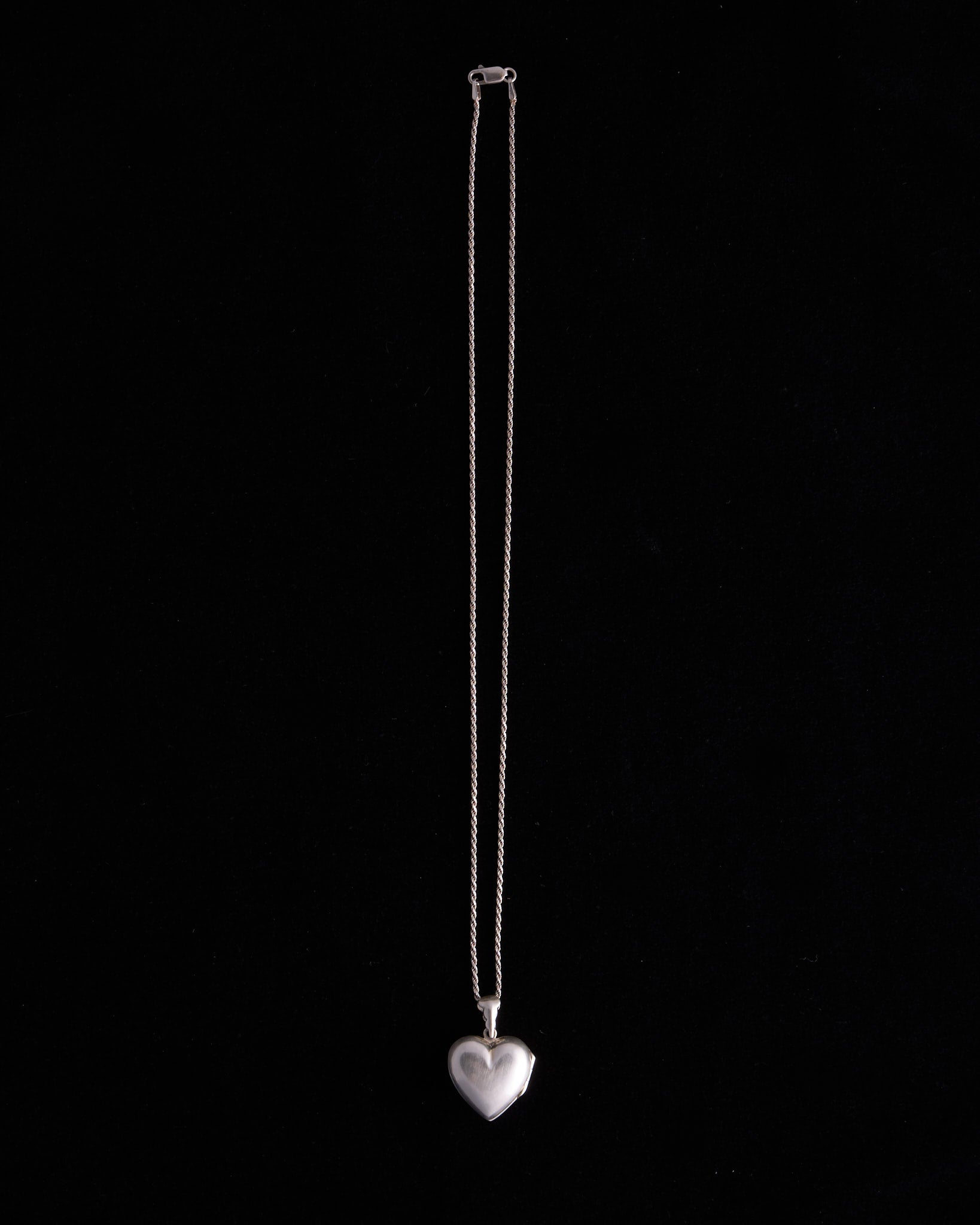 Romantic sterling silver heart locket necklace. Puffed heart pendant set with a heart-shaped amethyst center stone, on a twisted rope chain.