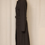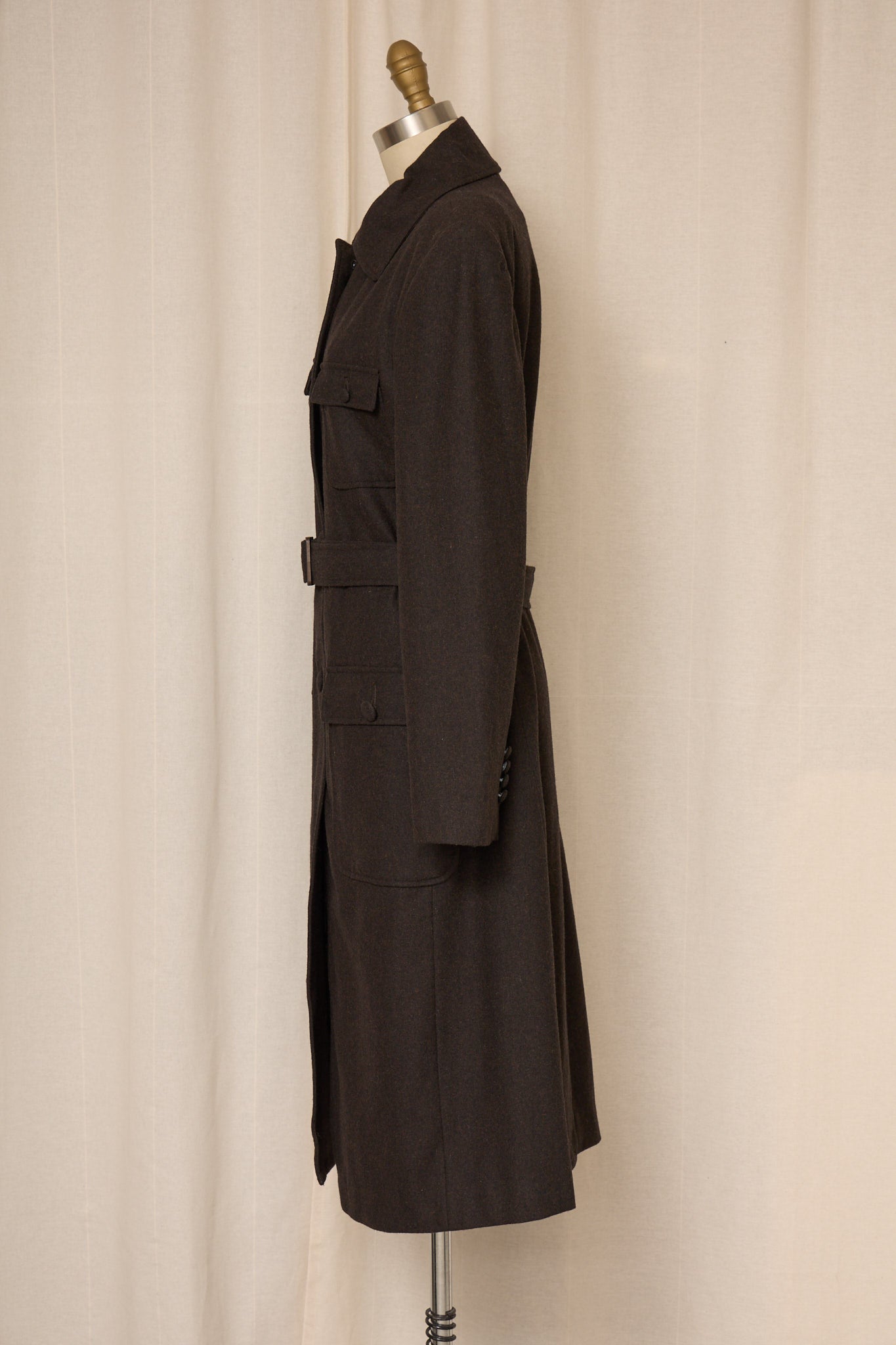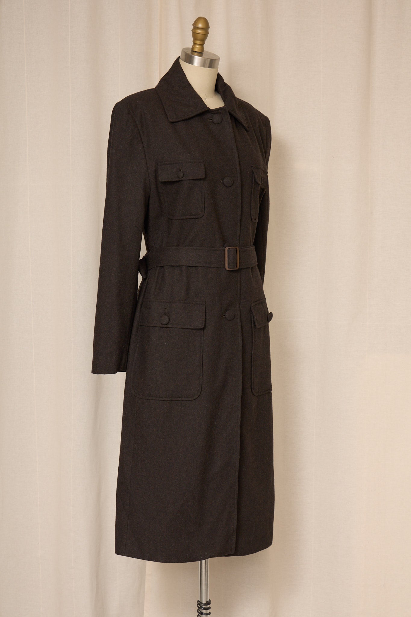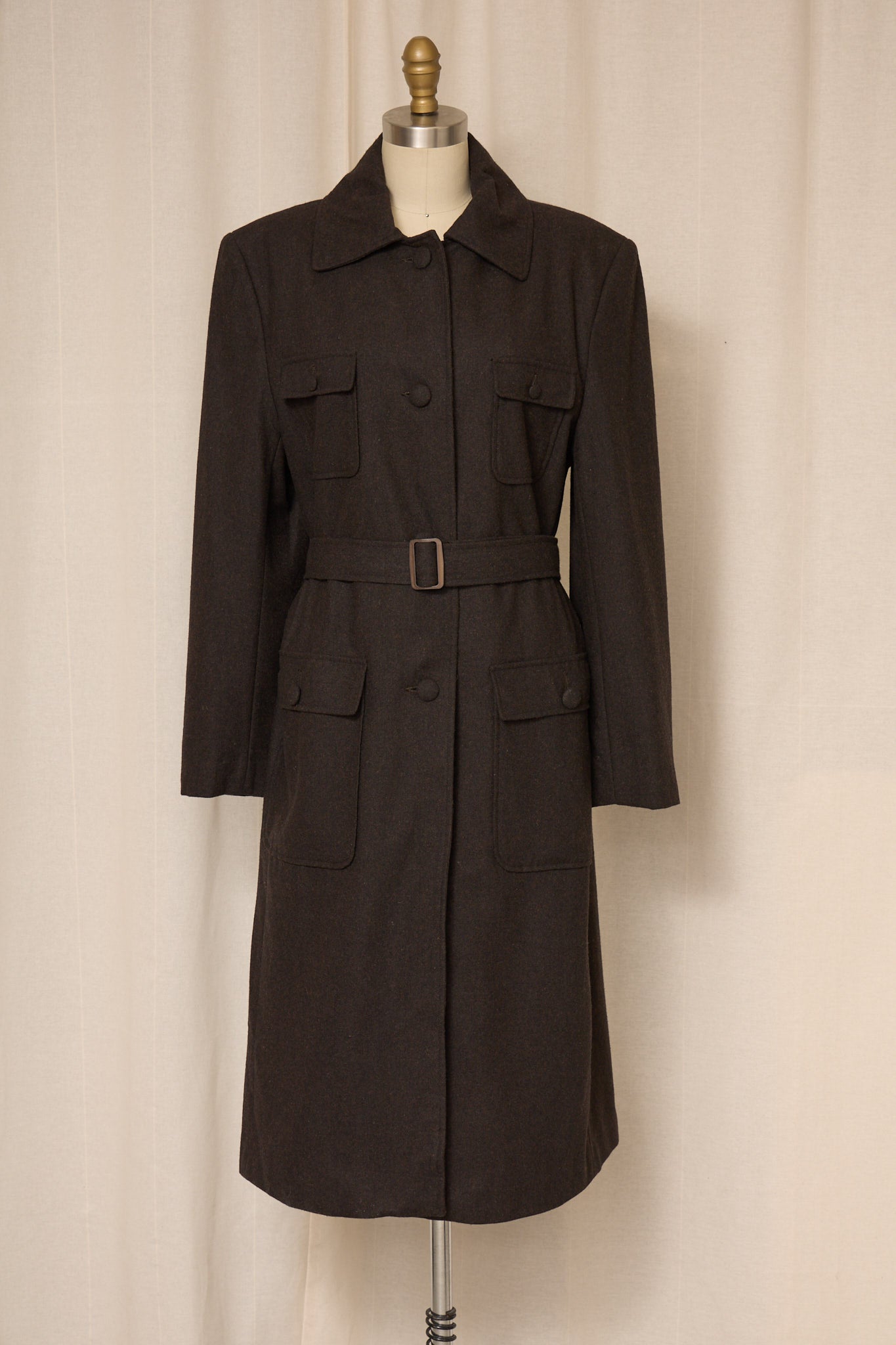 Vintage brown wool belted coat with structured tailoring, flap pockets, and classic silhouette. Fully lined. Timeless everyday outerwear.