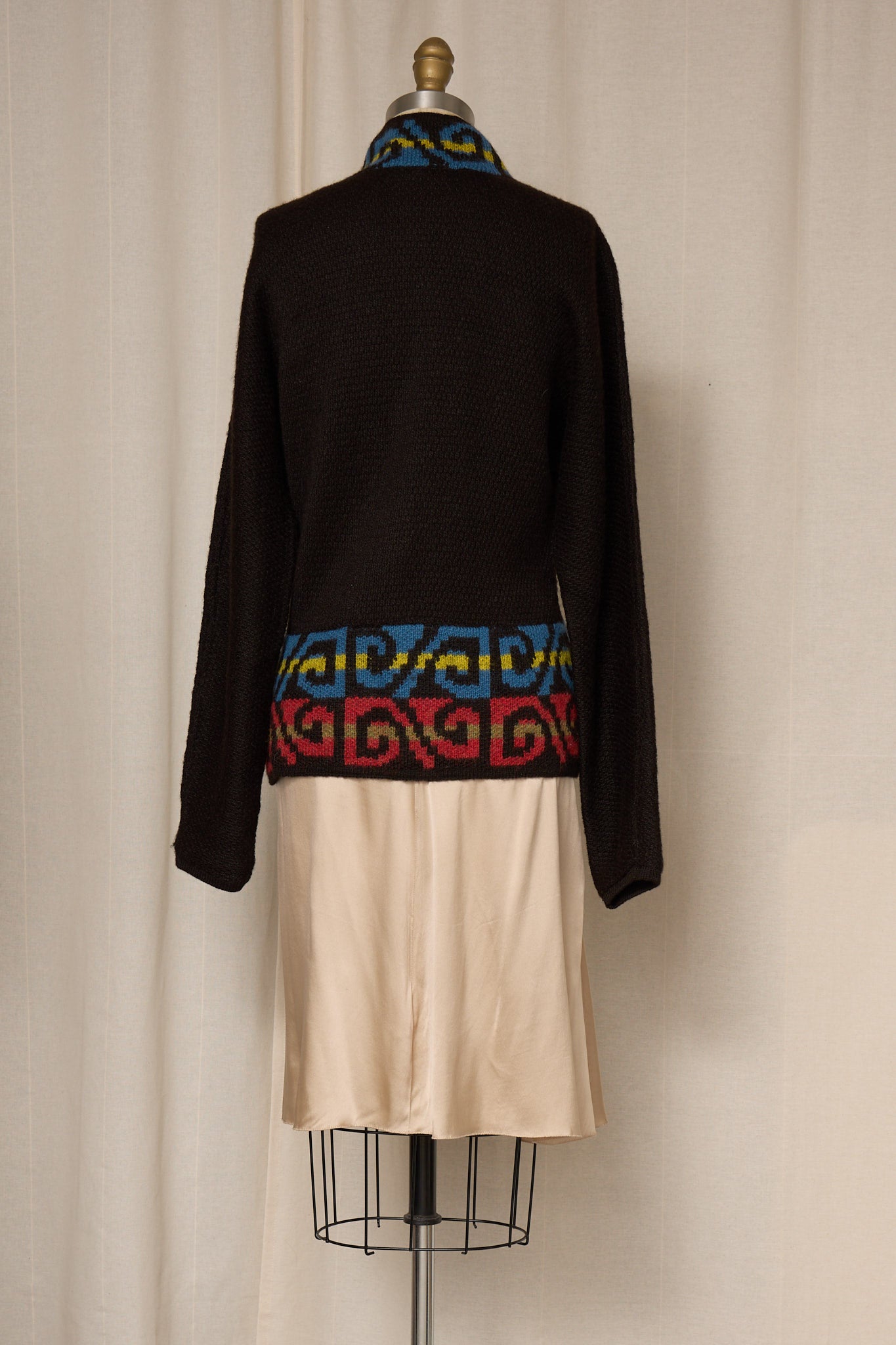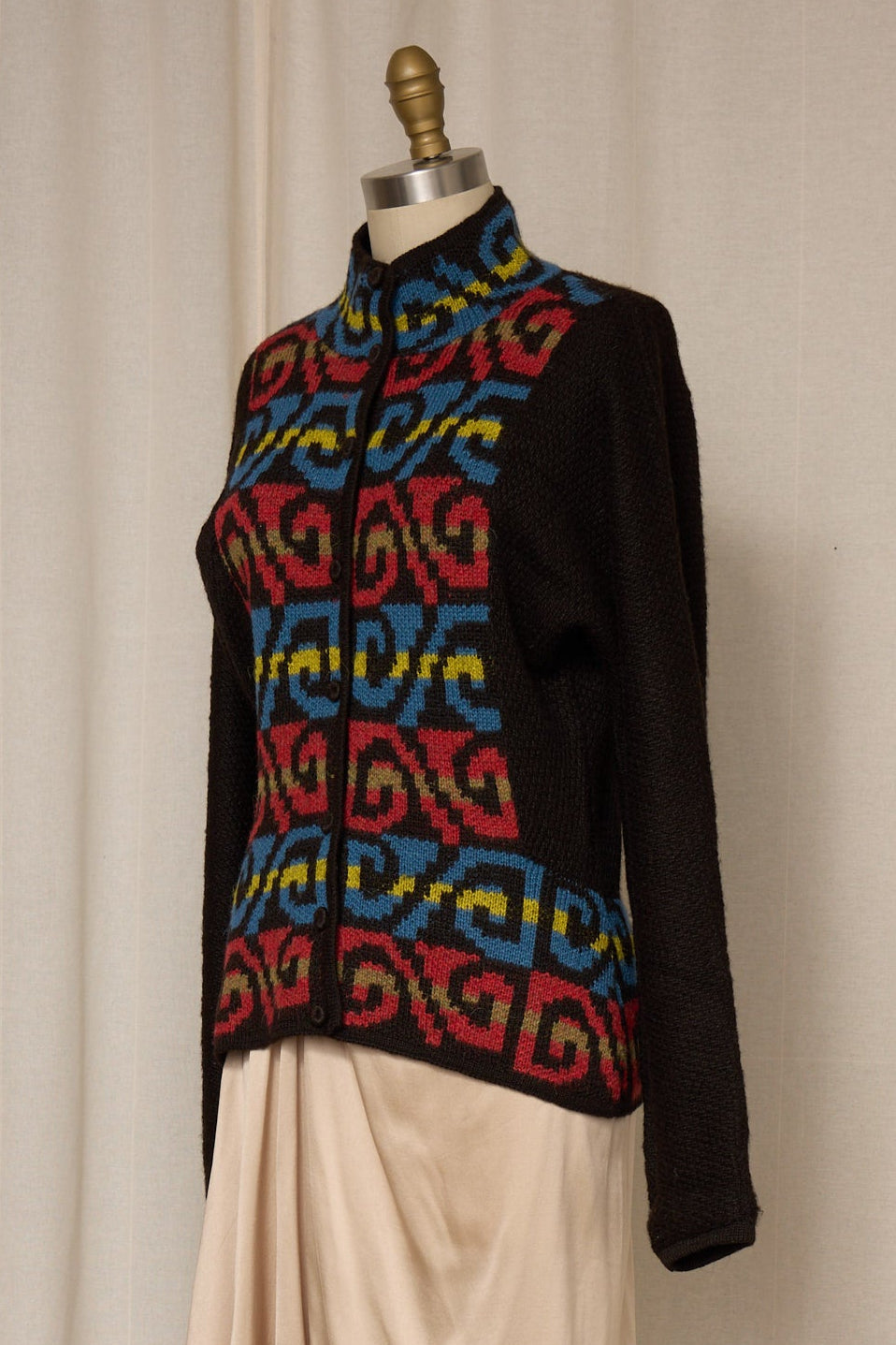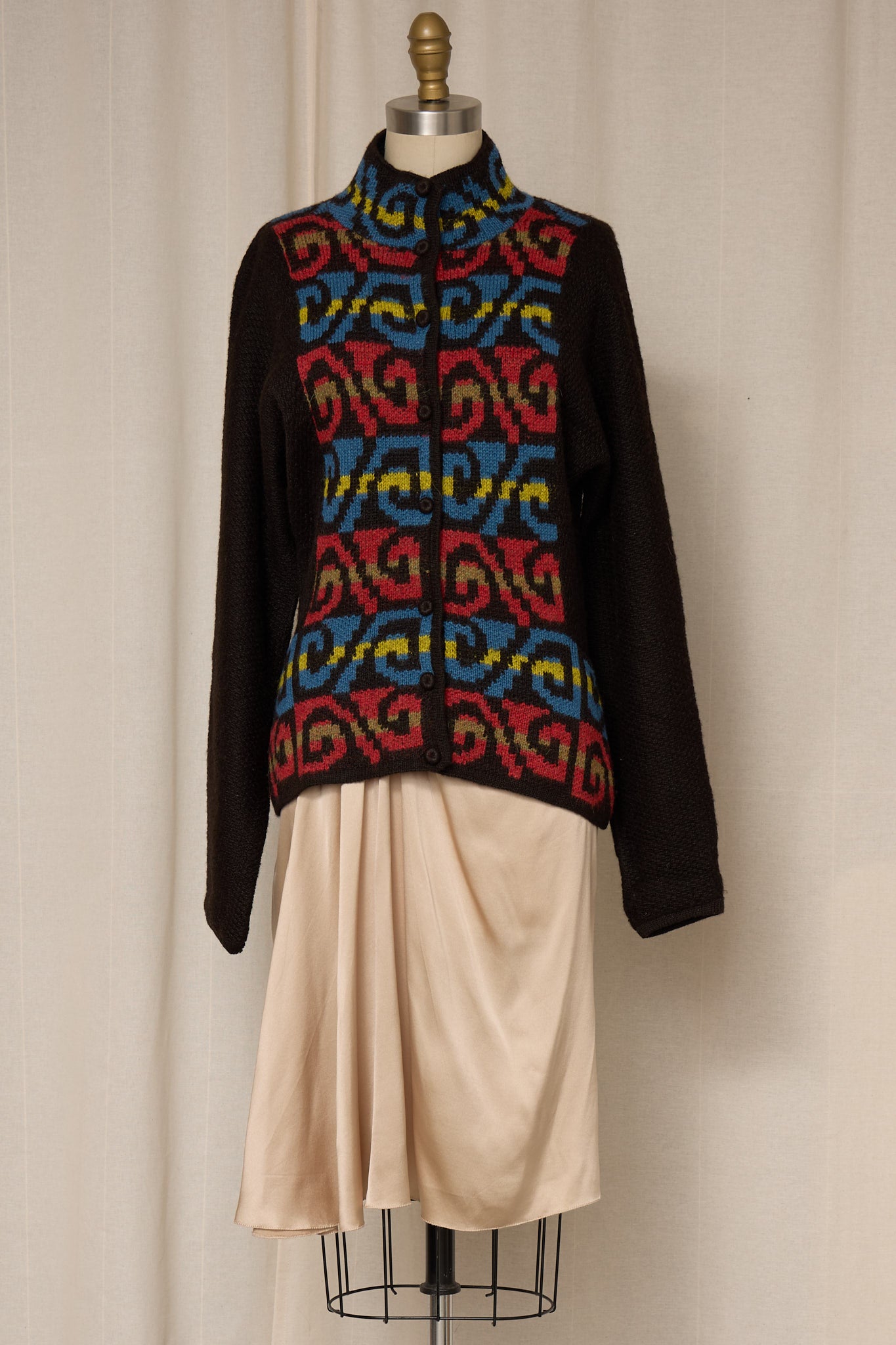 Handwoven alpaca wool cardigan, brown knit with multicolor patterning. Button closure, relaxed silhouette, perfect vintage condition.