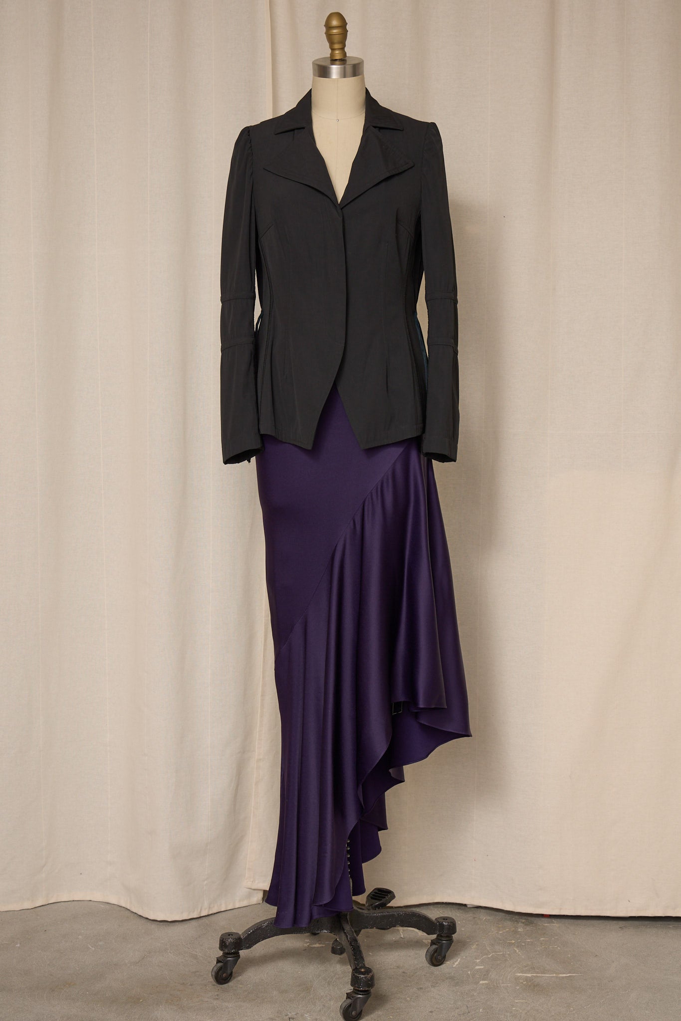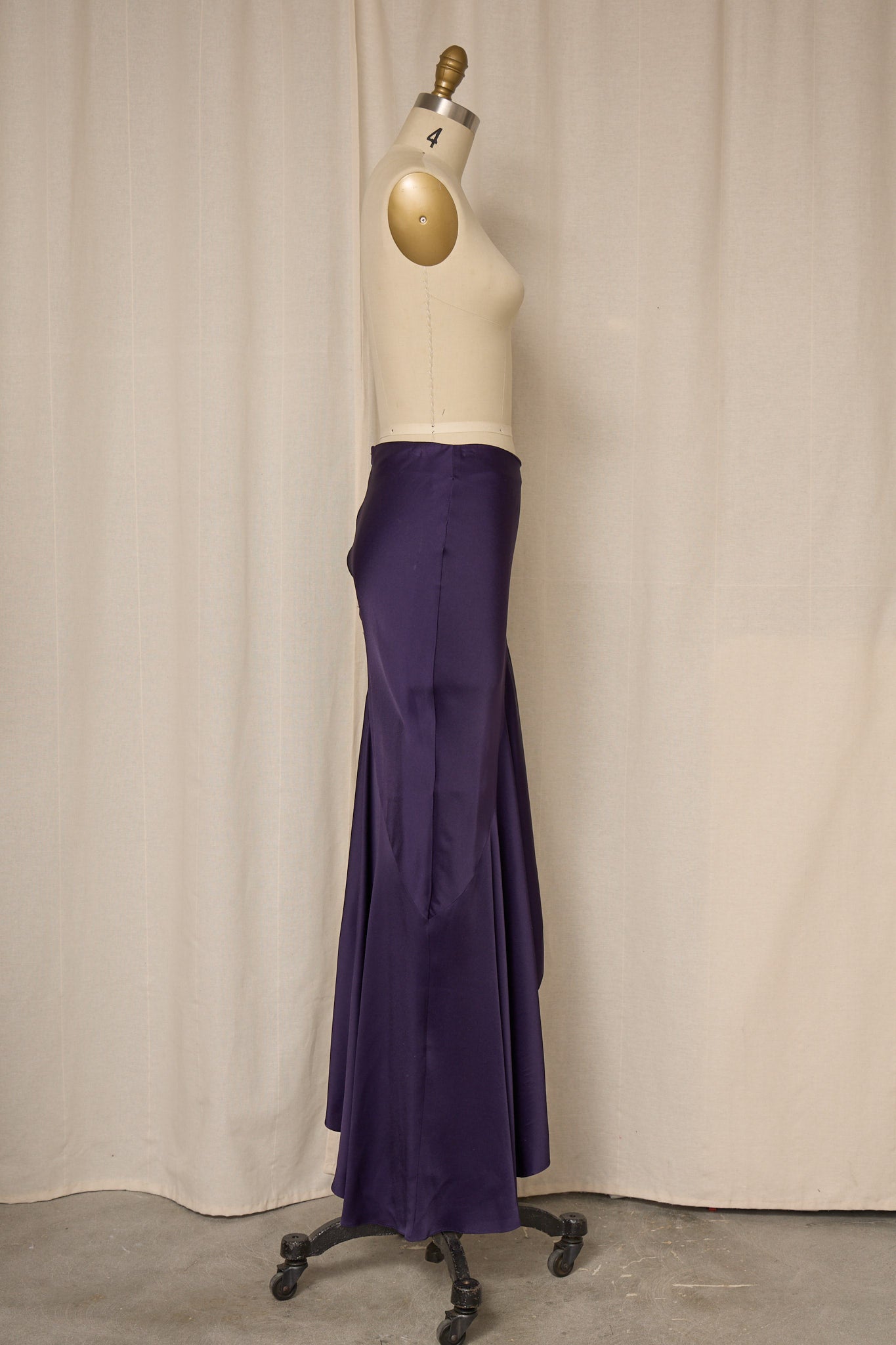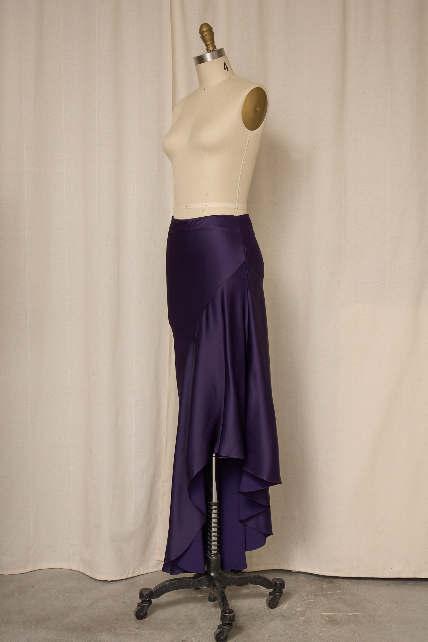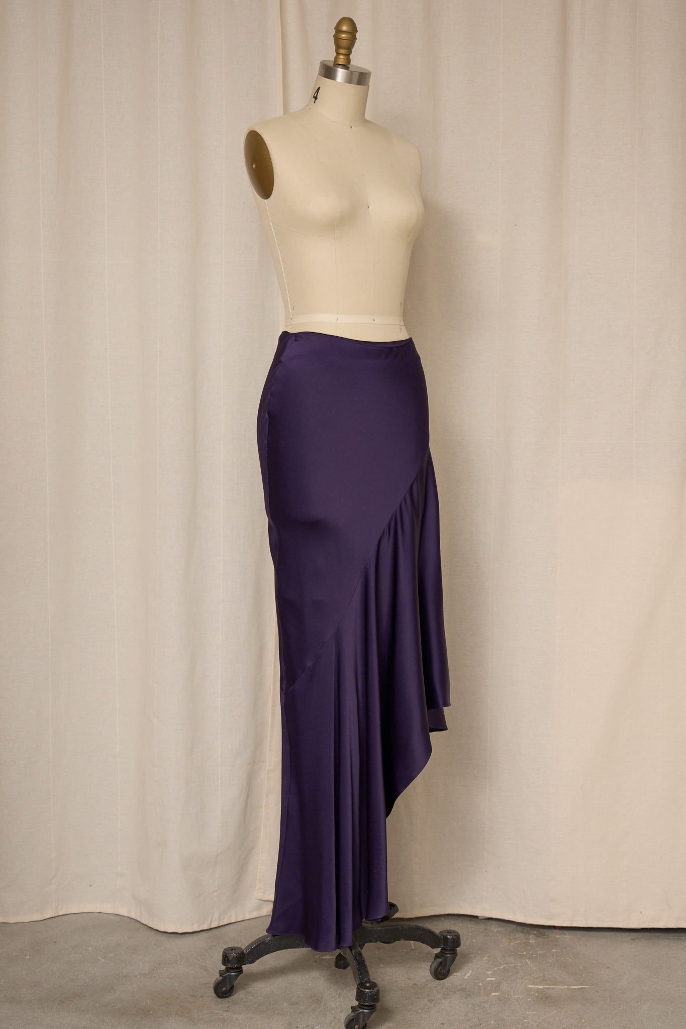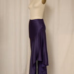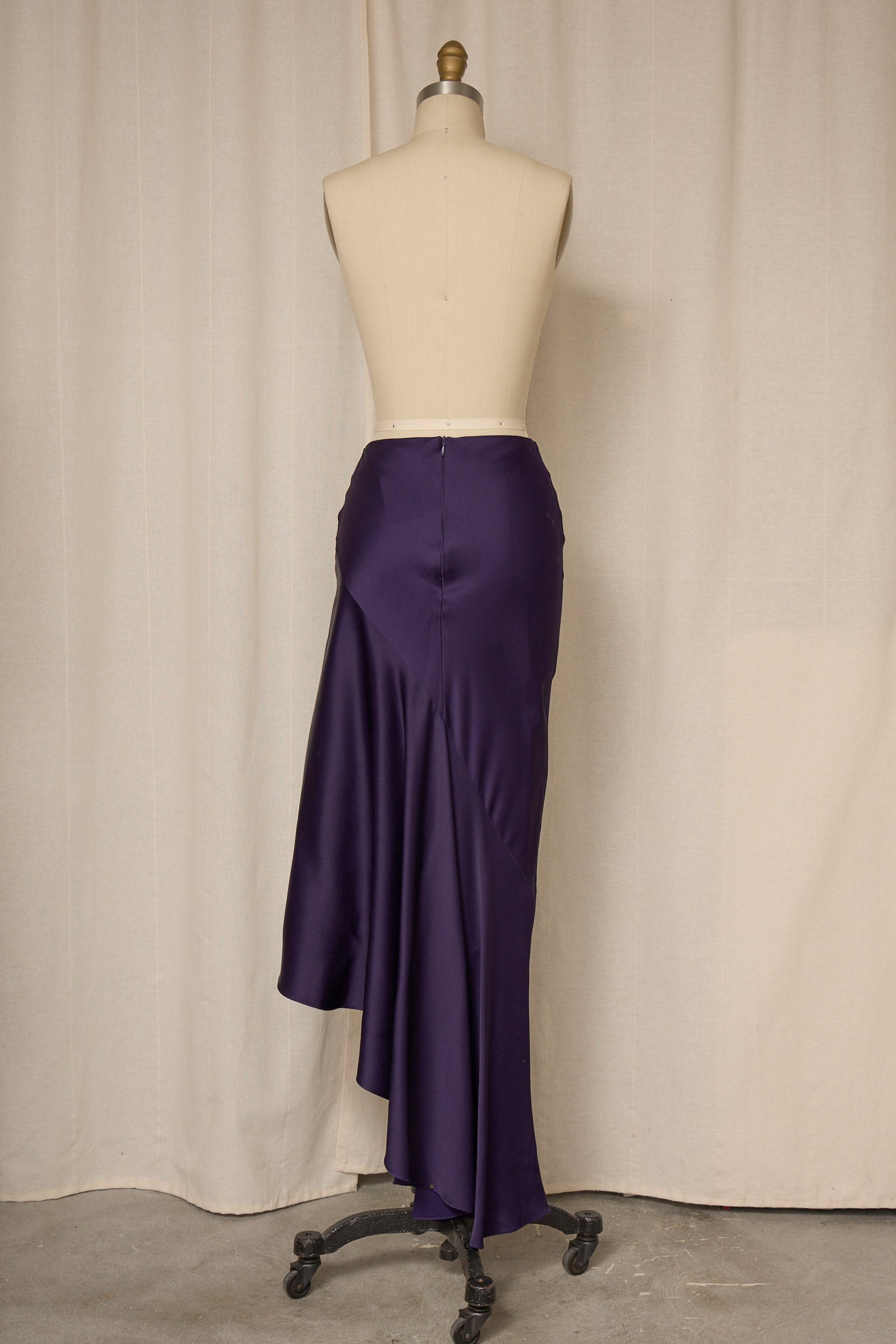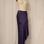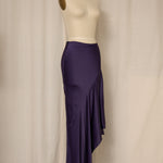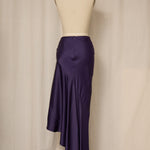 Vintage rich purple asymmetrical long skirt in satin fabric with zipper closure at waist. Very good vintage condition, no flaws or signs of wear.