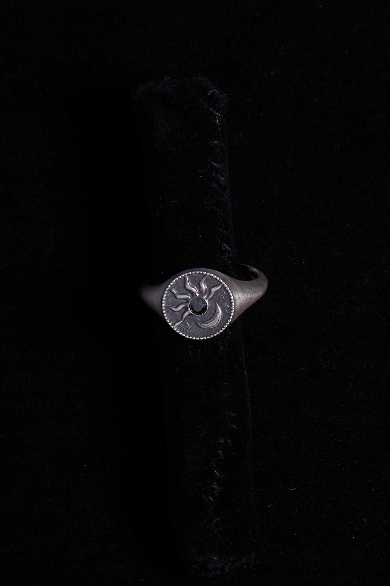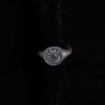 Vintage sterling silver signet-style ring featuring an engraved sun motif with a stone center.