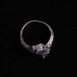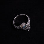 Vintage sterling silver ring with butterfly detailing and a soft blue cabochon centerpiece.
